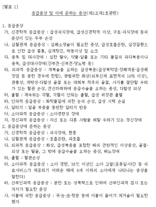 응급증상[별표]에 해당하지 않으면 응급실을 이용하더라도 본 제도 이용대상이 아닙니다.