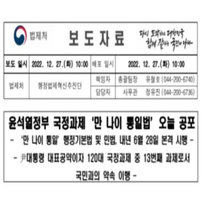2022년 12월에 민법개정안과 행정기본법개정안을 의결했기에 2023년 6월 28일부터 만 나이를 시행합니다.