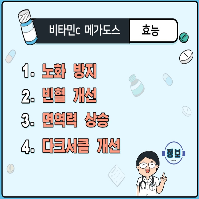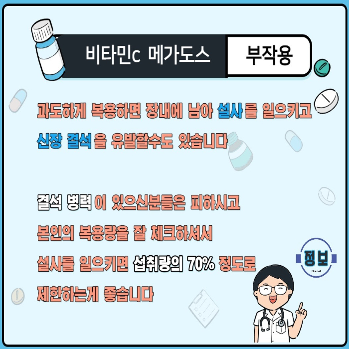 비타민 C 메가도스 섭취는 일반적으로 안전하지만 과다한 섭취로 인해 결석이나 설사 같은 부작용이 유발할 수 있습니다.