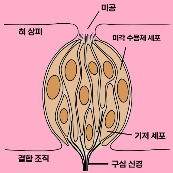 미각(味覺)은 인간이 가진 오감(五感) 중 하나로 입 안의 혀에 위치한 감각으로 물질의 맛을 느낄 수 있습니다. 인간은 혀의 표면에 위치한 미뢰(taste bud)라는 감각 기관을 통해 미각을 느낄 수 있고 입 안에는 약 1만 개의 미뢰로 이루어져 있으며 각각의 미뢰를 이루는 세포들은 그 역할에 따라서 미각을 직접적으로 수용하는 미각세포(taste cell))와 하단부에서 지지 및 세포 보충의 역할을 하는 기저세포(basal cell)로 나눌 수 있습니다.